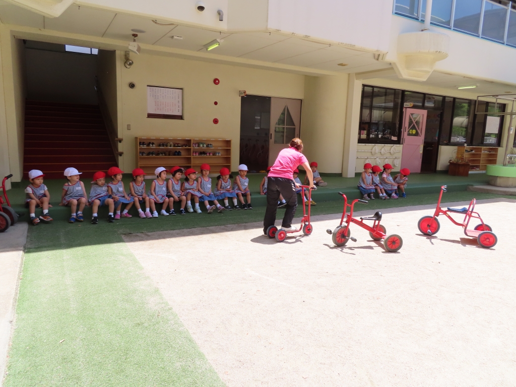 年少組さんは先生から三輪車の乗り方を教わりました!しっかりお話を聞き、正しい乗り方を守り楽しみましょう♪