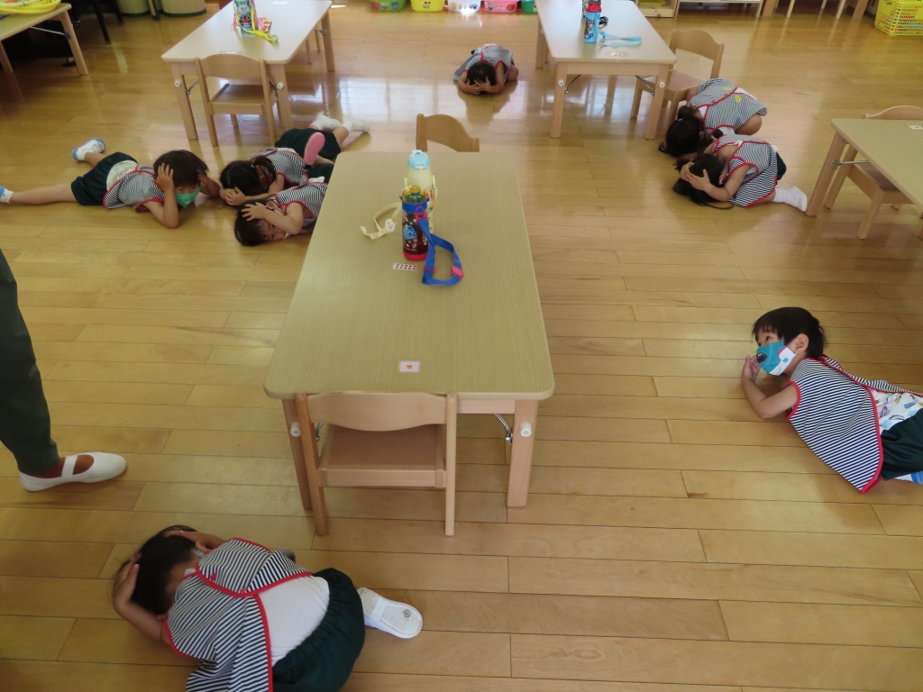 揺れがおさまるまで座って頭をおさえ、先生のお話をよく聞き