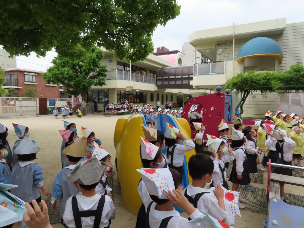 作った兜を被りこいのぼりをあげました!空高く泳いでましたね♪