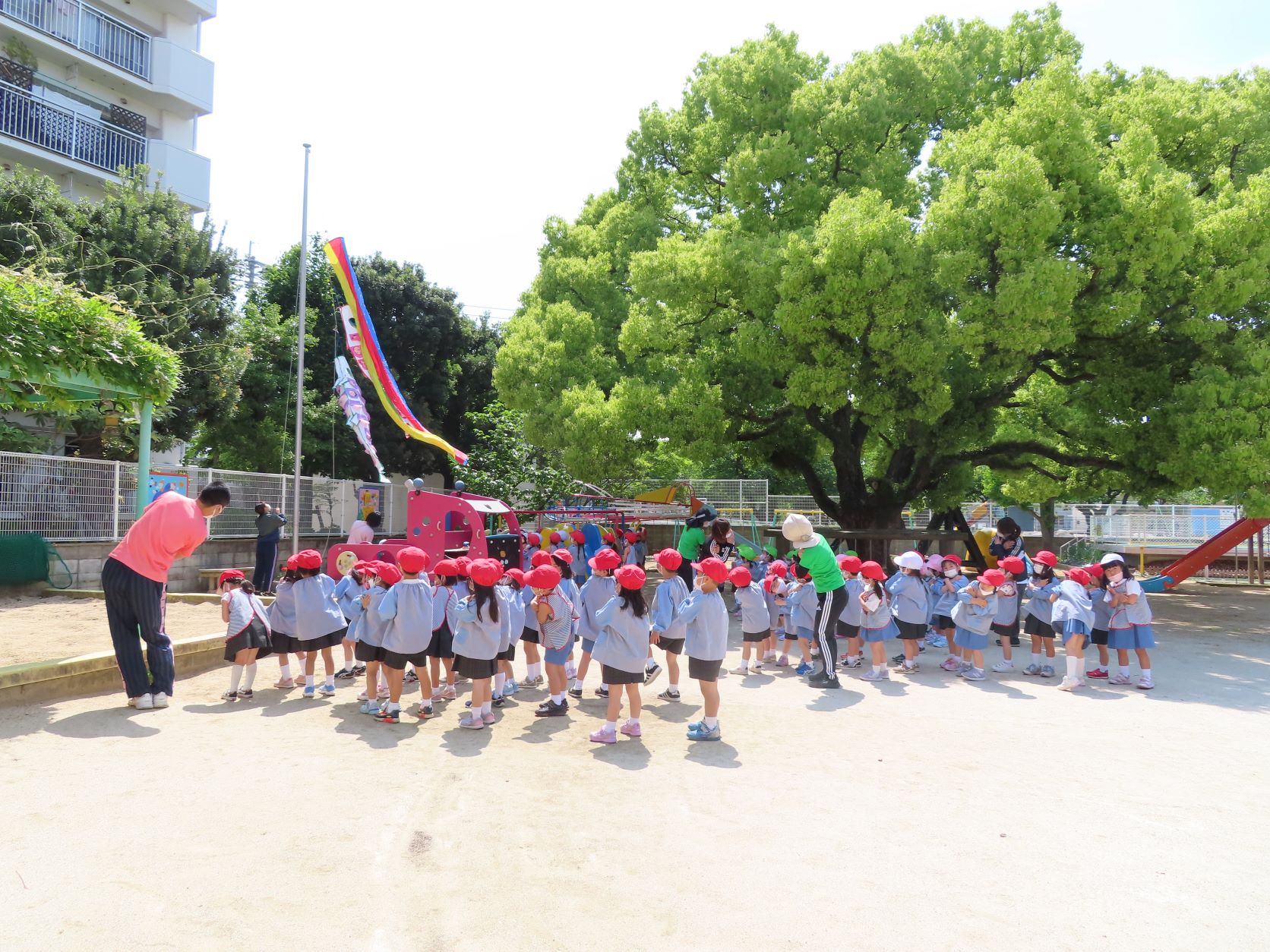 そしてみんなが「がんばれ!」と大きな声で応援すると、こいのぼりが空高く泳ぎ、子どもたちは大喜びでした!
