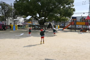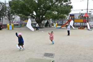 雨が上がり、園庭でたこを飛ばしてます!