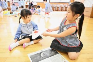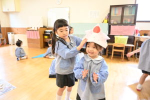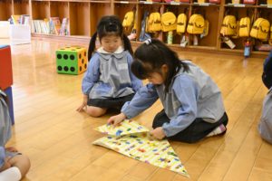 年長組のお兄さん・お姉さんが年中組、年少組のお部屋に行きかぶとを折りました!