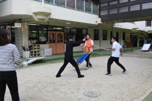 警察の方にお越しいただき、実際に不審者が園内で侵入したことを想定し行いました。
