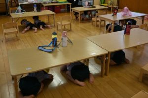りんご組も机の下にもぐり自分の頭を守りました!