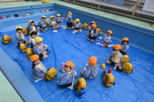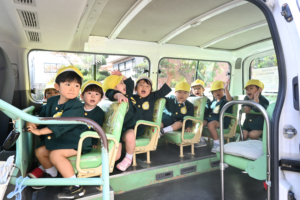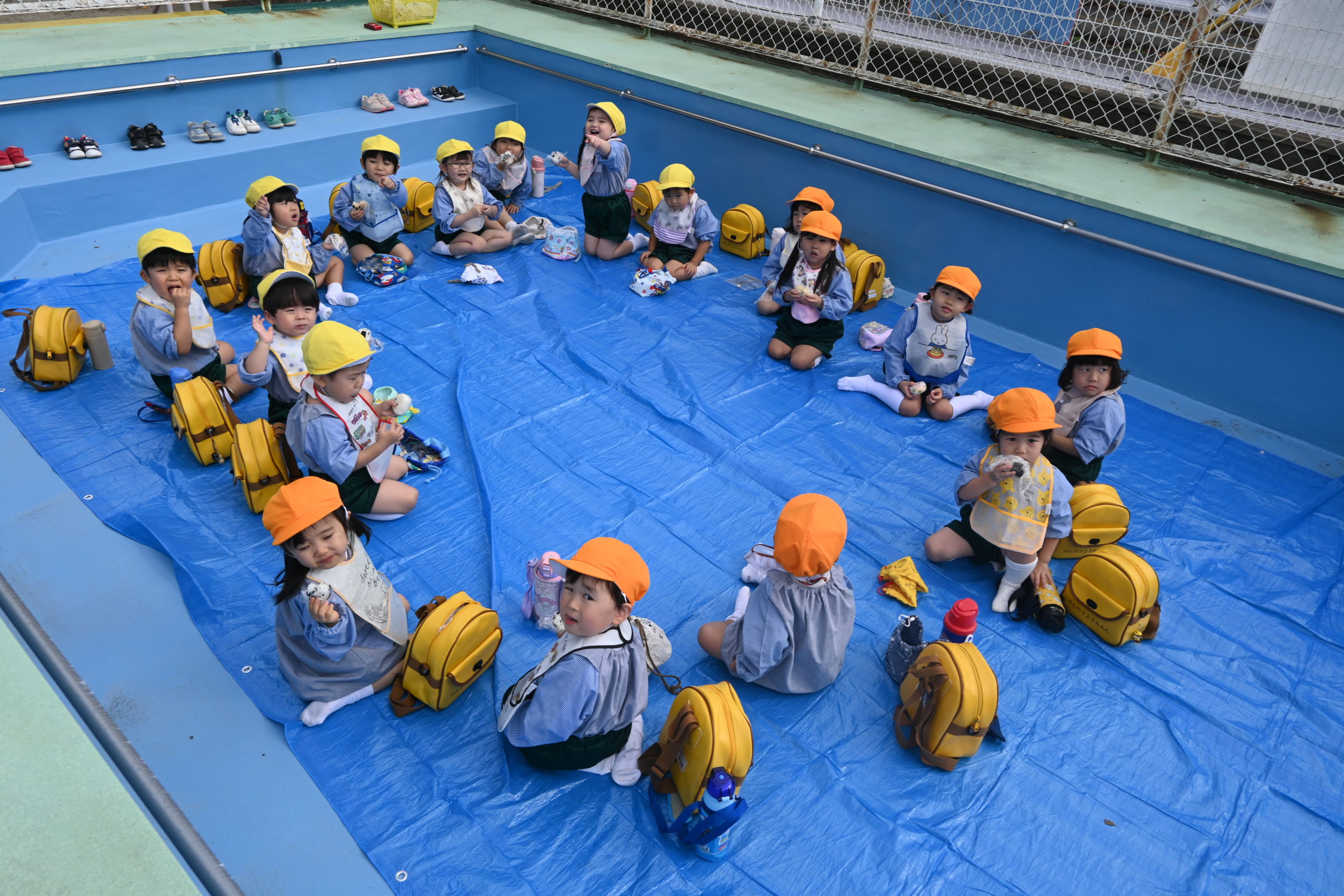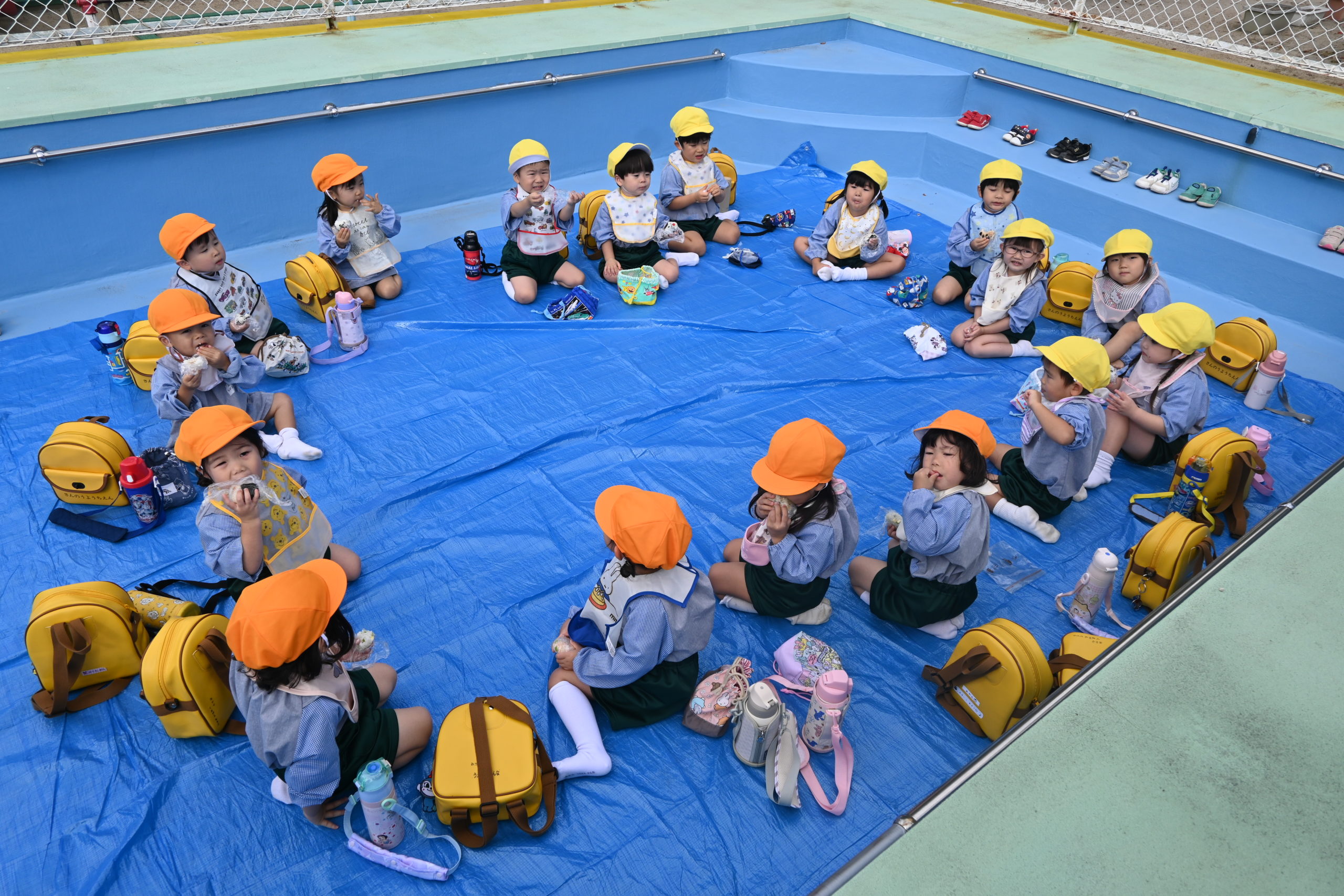 お昼は、年少々のみかん組と一緒に青空の下でおにぎりとおやつをいただきました🍙
