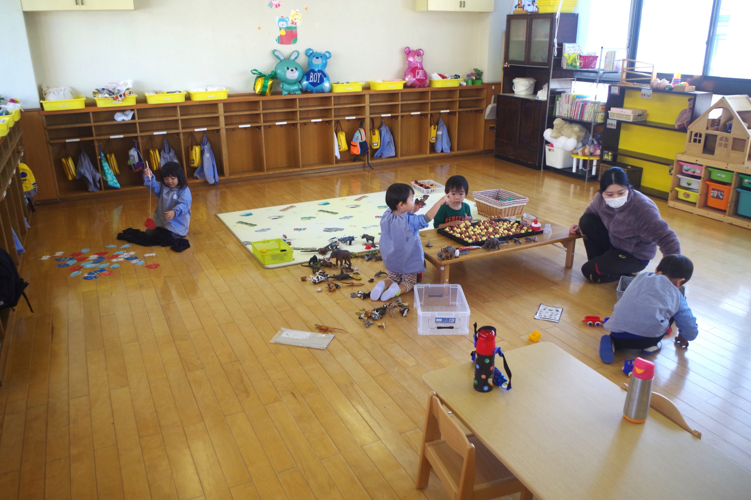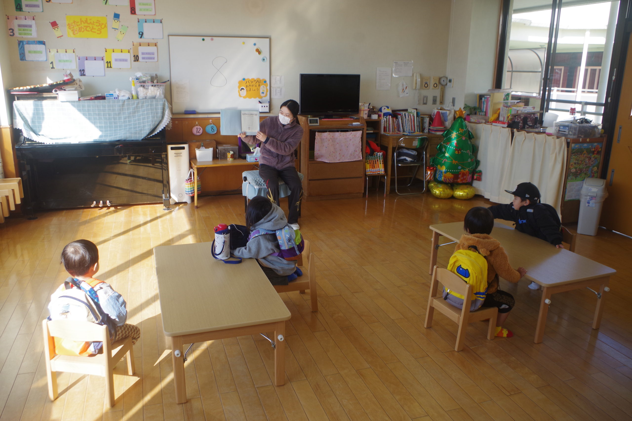 帰りのあつまりでは座って絵本をみて、最後はみんなで「さようなら」をして帰りました♪