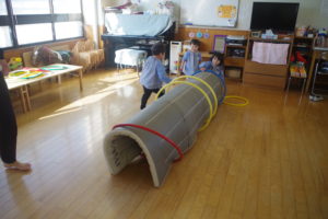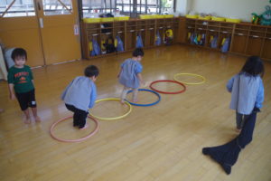 運動遊びではフープをジャンプして進んだり、マットをトンネルにしてハイハイでくぐっていきました!