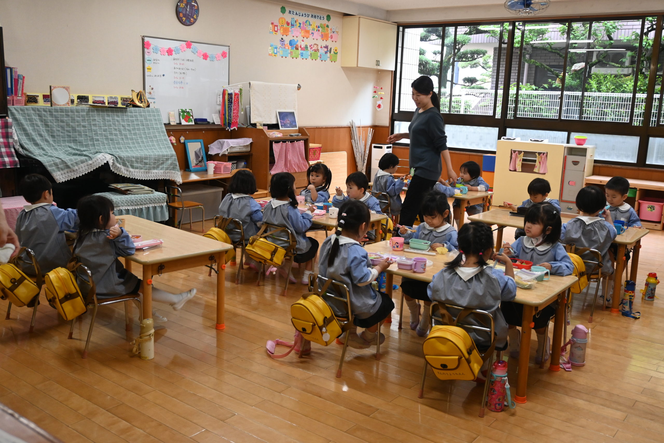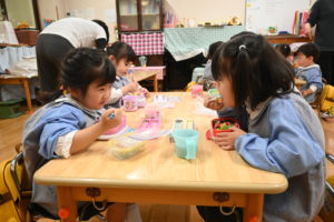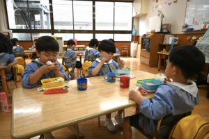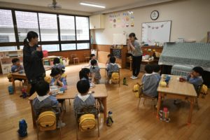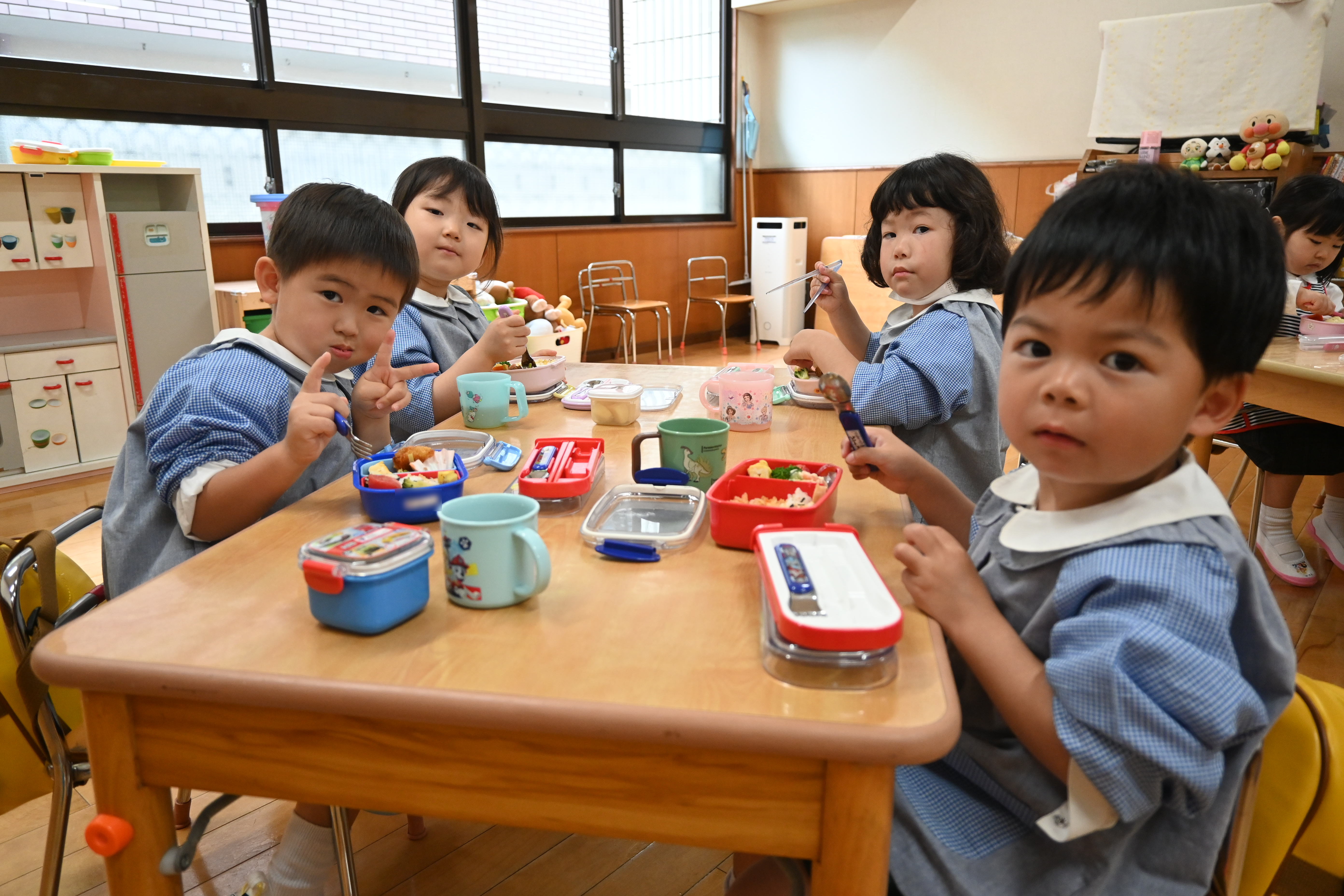 お弁当の歌をうたい、みんなで手を合わせていただきます♪