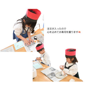 お寿司を作って先生に配達したいとのことで、自分たちのアイデアで作ってました☺