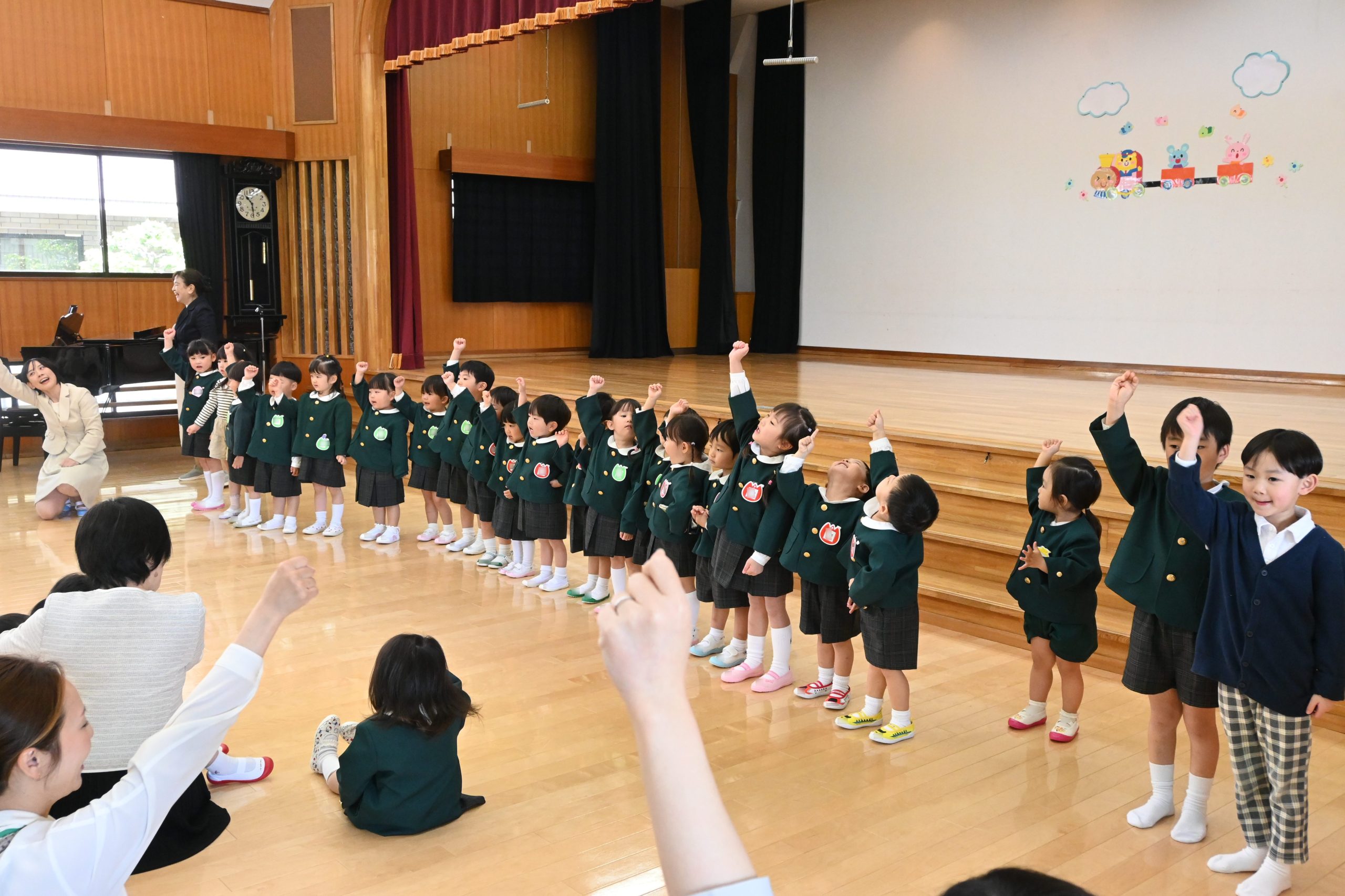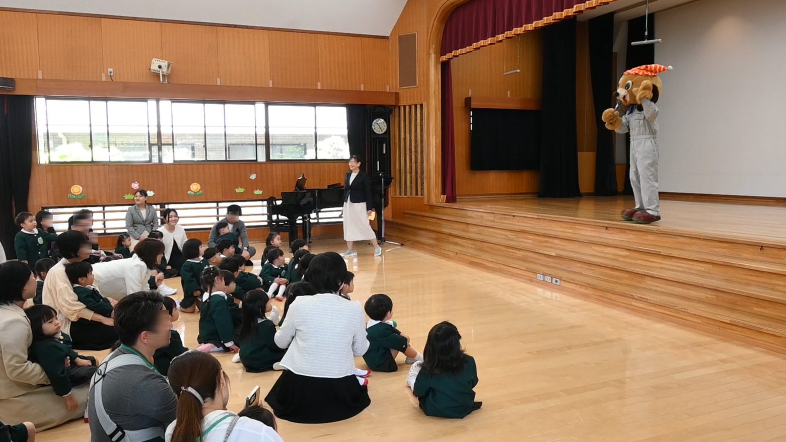 ↑さんきちくんが皆さんに会いに来ました🐶↑元年少々組のお友だちと新入園児のお兄さんお姉さんが皆の前で「山王幼稚園の歌」を歌いました!