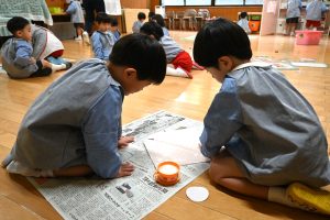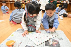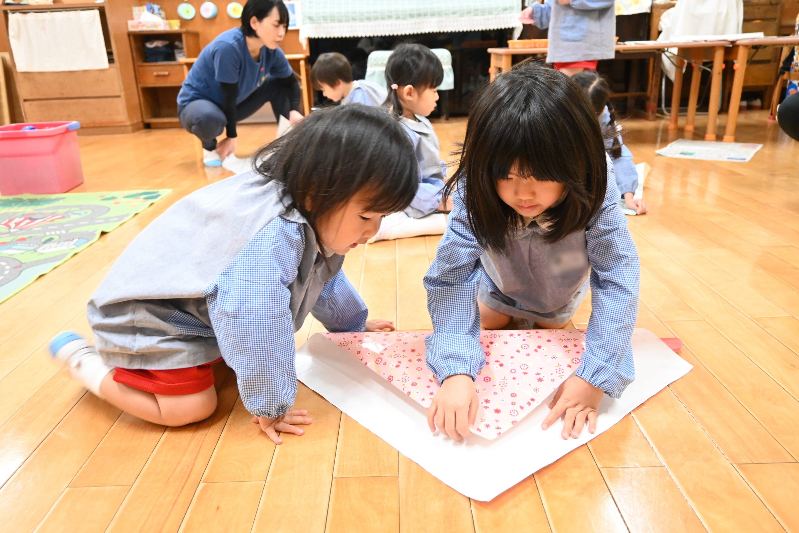 年長組のお兄さんお姉さんが年少組のお部屋に行きかぶとを折りました!