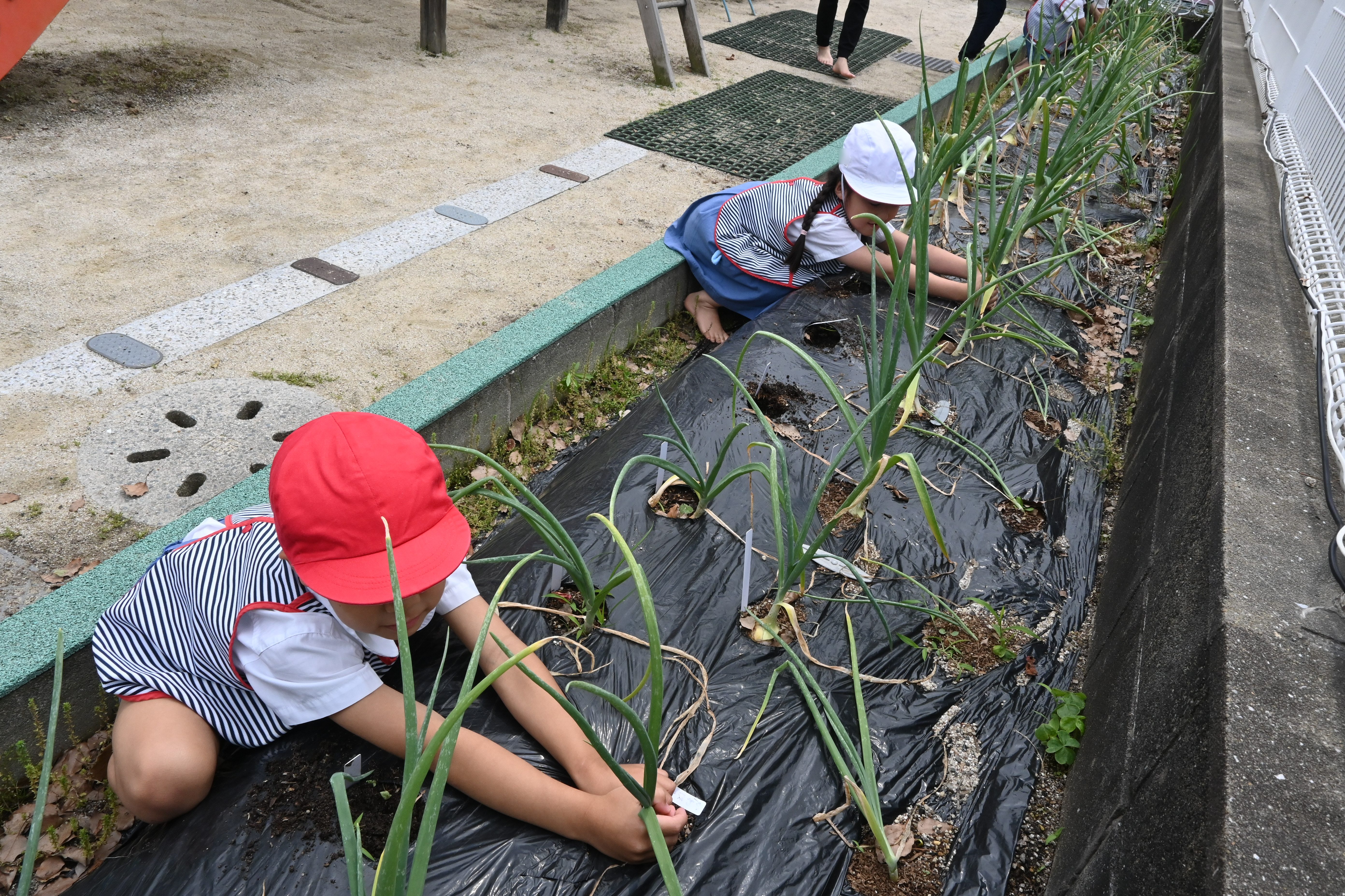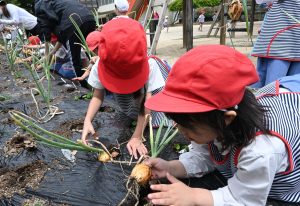 土の中から顏を出した玉ねぎに、みんなニコニコ☺収穫した玉ねぎは、それぞれお家に持ち帰りました。