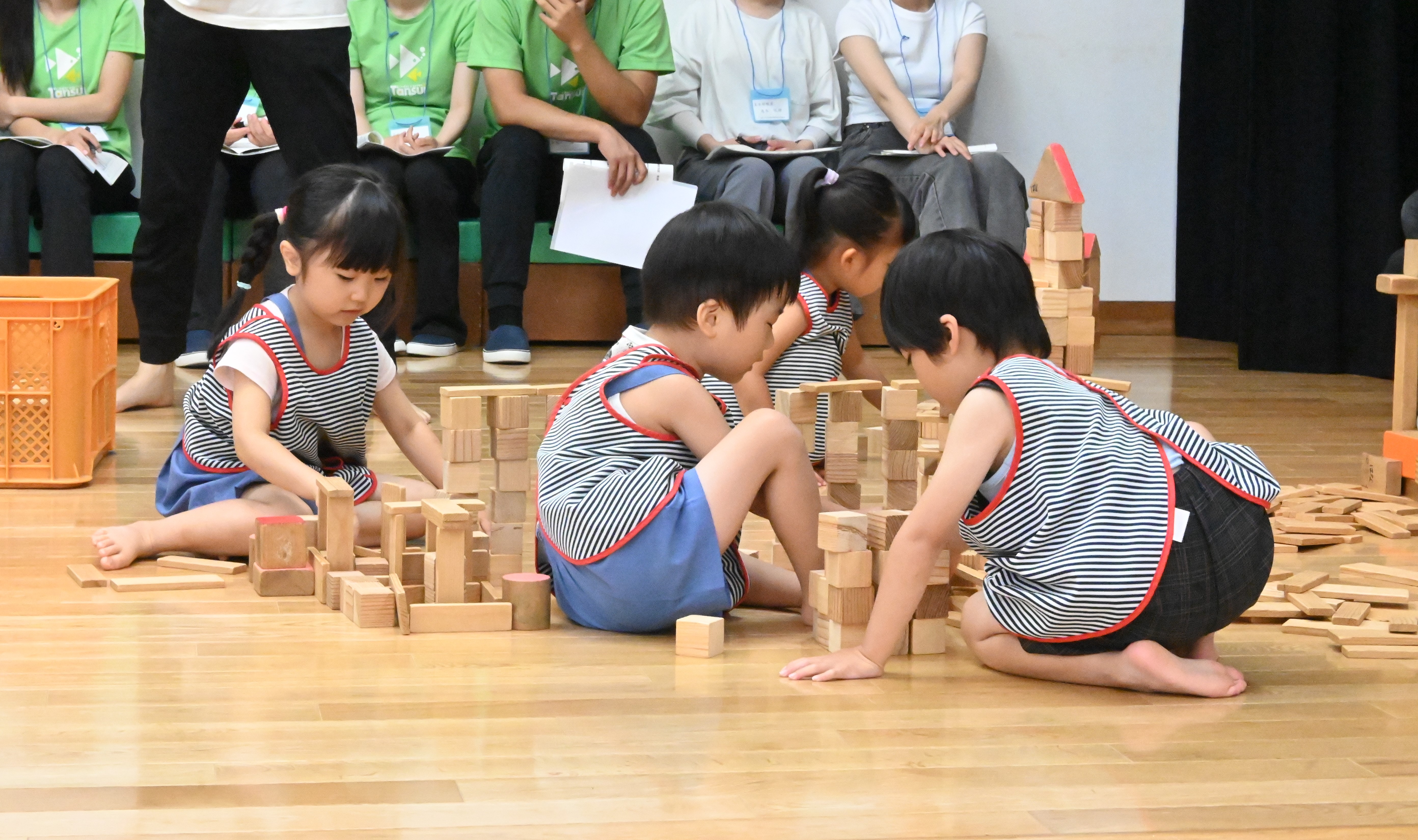 一人ひとりがイメージする建物や道、公園などを自由に作るところから始まり、「手伝うよ!」「ここに橋をかけよう!」と、友だちと協力して一つの大きな建物を作る姿も見られました✨