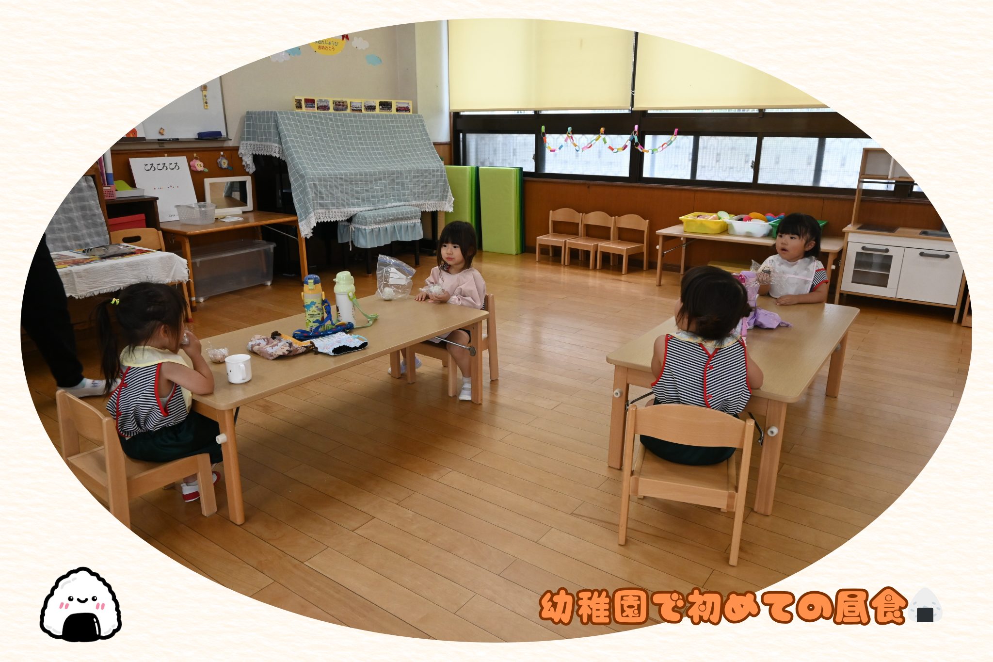 今日は幼稚園で初めての昼食です!お家の方が握ってくださったおにぎりを食べました🍙