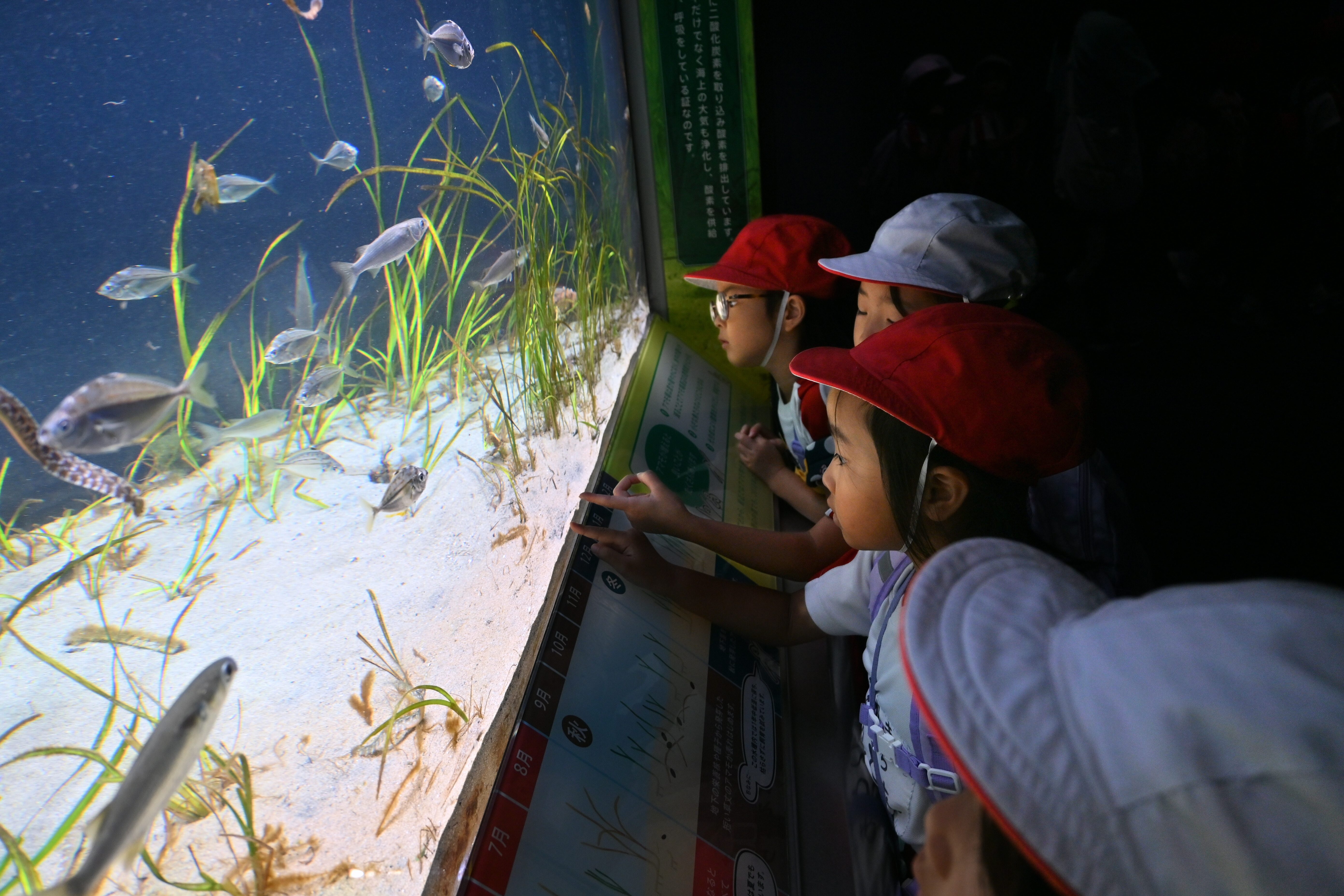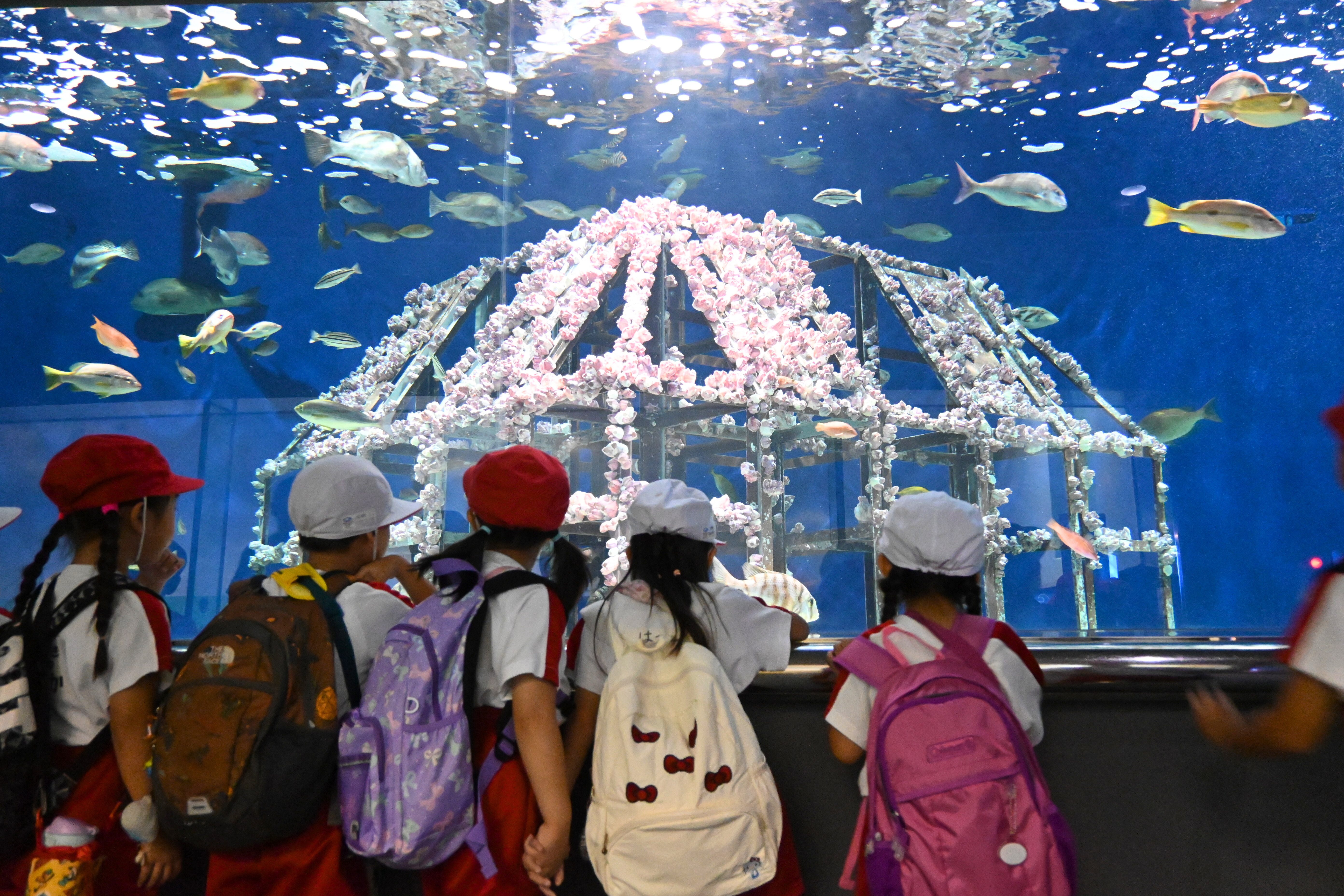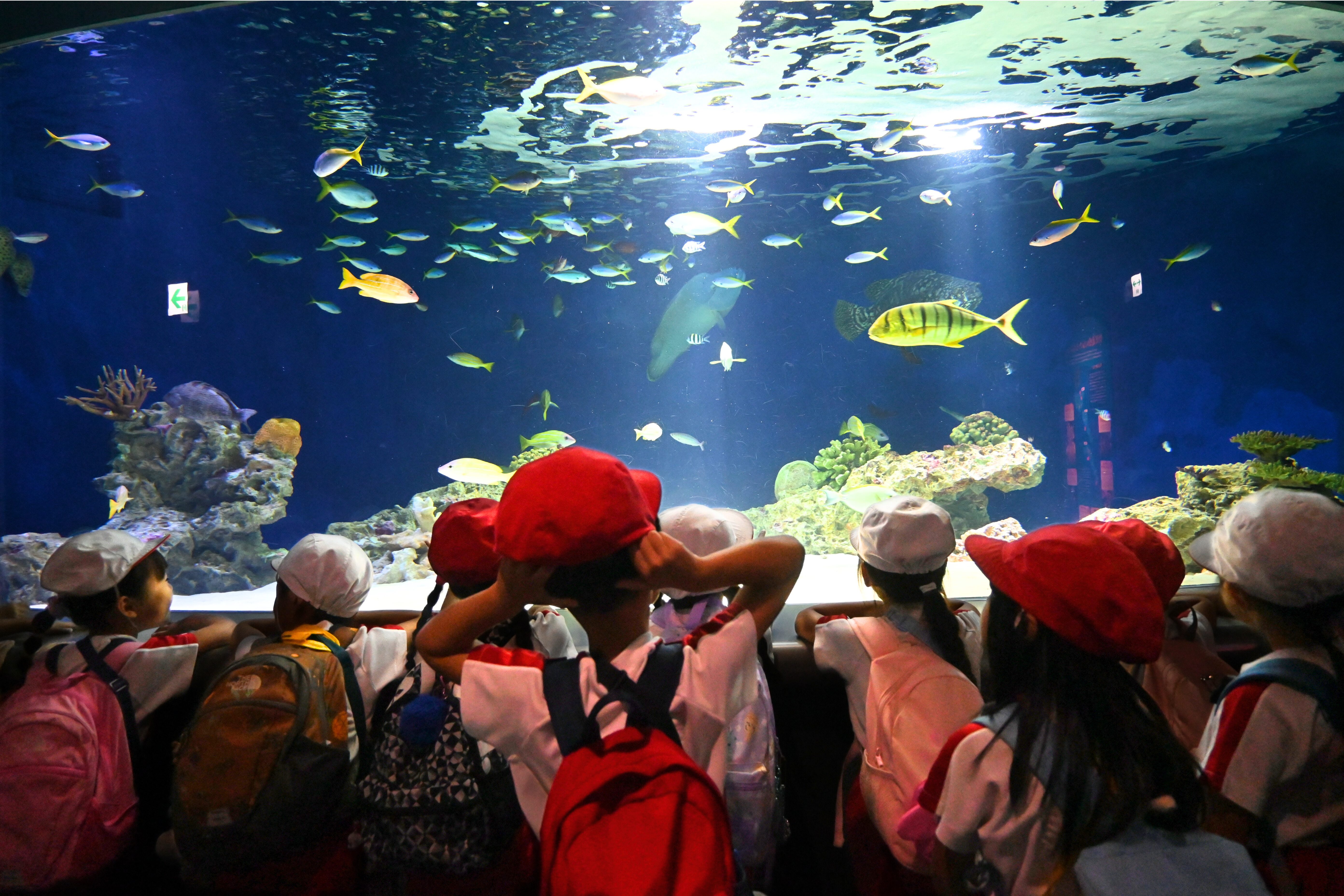 館内では、色とりどりのお魚たちを見たり、大きな水槽を泳ぐサメやエイに「すごーい!」と大興奮!👀