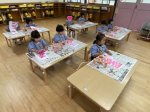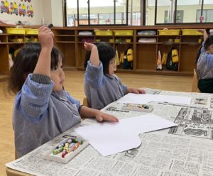 年少々のりんご組が初めての造形遊びを行いました🎨先生のお話をよく聞き、「サンタの長ぐつ」を描きました☺ ぐるぐるの線やギザギザの線を描いたり、絵の具を使って作成しました!初めての活動にワクワクした様子の子どもたち一人ひとりの個性が感じられる、素敵な作品が完成しました✨