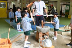 せいろで蒸かしたもち米を使って、みんなでおもちつきを楽しみました!