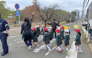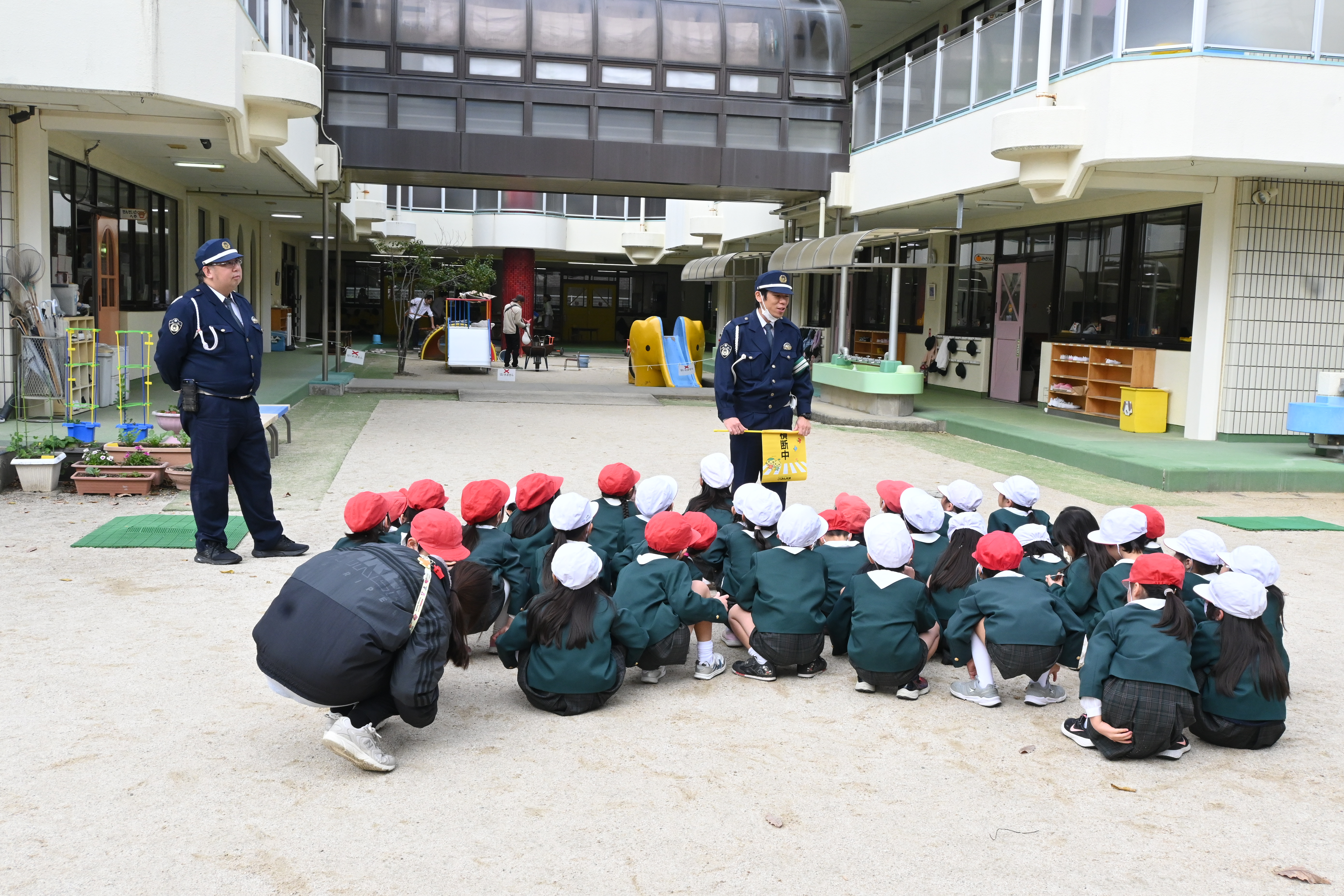年長組、交通安全教室がありました!警察の方にお越しいただき、横断歩道の渡り方・交通安全について教えていただきました👮体験を通して、交通ルールを楽しく学ぶことができました!合言葉は「としおくん」!・と 飛び出さない・し 信号機を守る・お 横断歩道を渡るこれからも「としおくん」のお約束を守って、安全に過ごしていきましょう✨