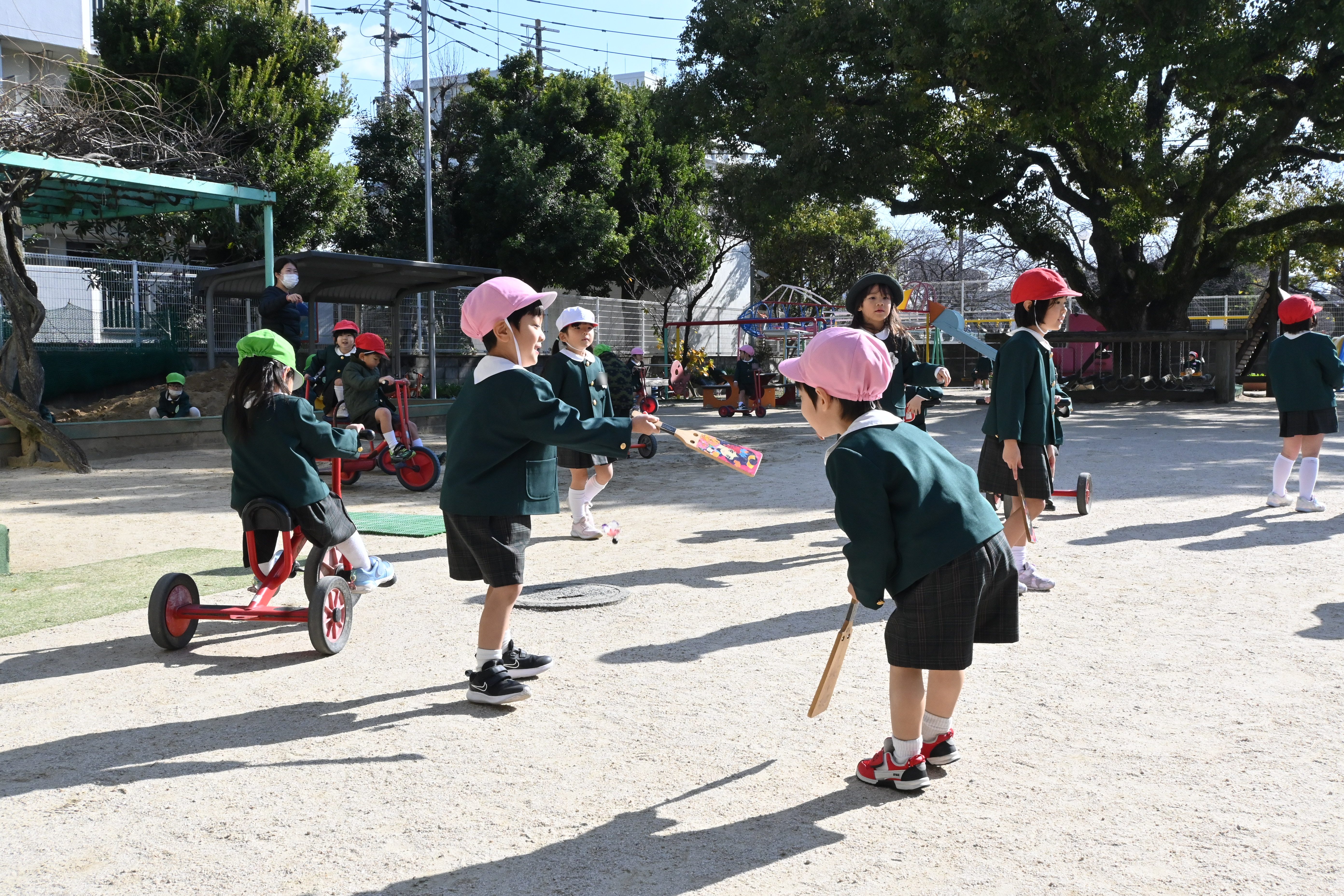 あけましておめでとうございます🎍3学期の始園式を行いました。久しぶりの登園でしたが、子どもたちは元気な笑顔を見せてくれました!園庭では、羽子板や竹とんぼなどのお正月遊びも始まり、元気いっぱい楽しみました♪ 3学期も一日一日を大切にしながら、楽しく園生活を送っていきたいと思います✨本学期もどうぞよろしくお願いいたします。