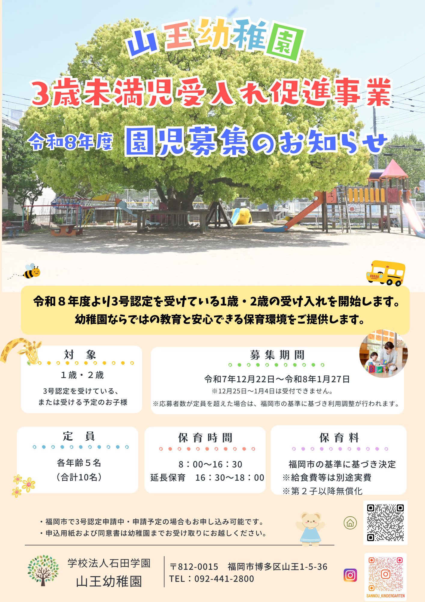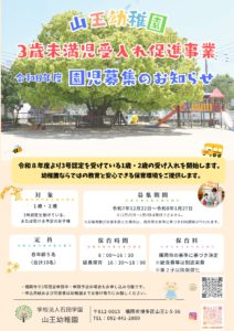 当園では福岡市「幼稚園3歳未満児受入れ促進事業」を活用し、令和8年度より、1歳児・2歳児の受け入れを開始することとなりました。 本事業は、保育の必要性が認定された「3号認定」を受けている、または受ける予定のお子さまを対象とした事業です。 働く保護者の皆さまを支援するとともに、幼稚園ならではの教育的視点を大切にした保育を行ってまいります。